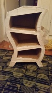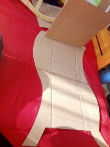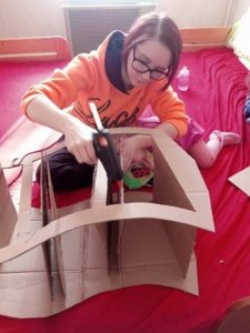 A ragasztásig semmi probléma nem merült fel lábra állítottuk és megpróbáltuk kikeverni a gipszet.. Elsőre nem sikerült ugyanis sokat raktunk bele és hamar megkötött.. Majd kis mennyiséggel próbálkoztunk és még nem massza állagúként felkentük a karton külső oldalára. Eléggé egyenletes külsőt kaptunk így fél óra után neki álltunk festeni.